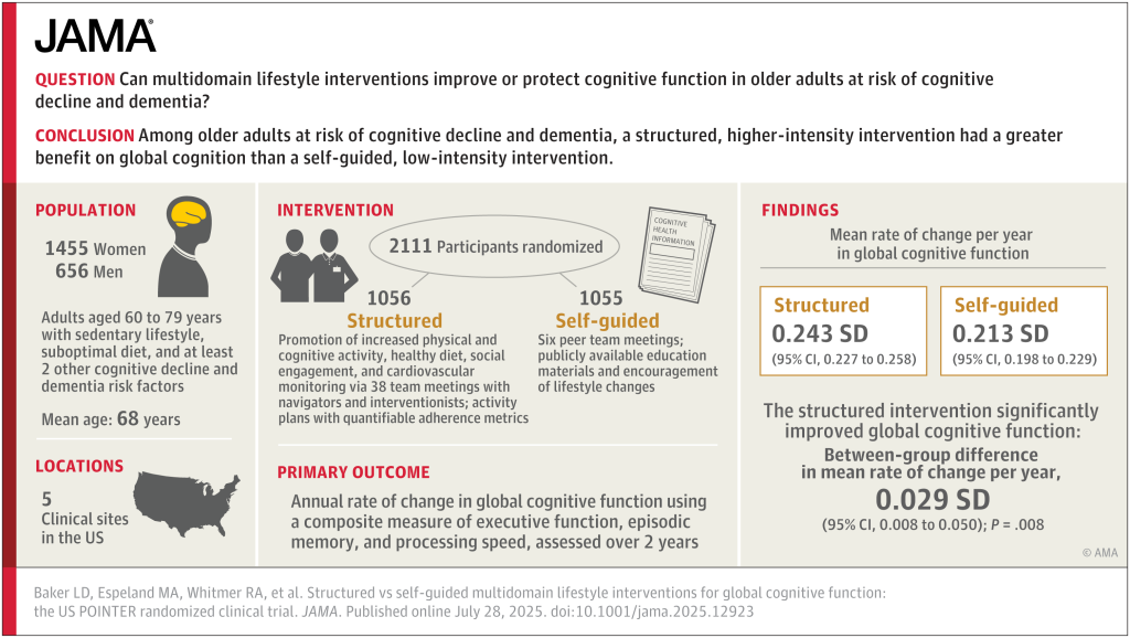 In a major publication in JAMA (The Journal of the American Medical Association) on July 28, 2025—and presented at the Alzheimer’s Association International Conference (AAIC)—researchers released findings from the U.S. POINTER randomized clinical trial, titled “Effects of Structured vs Self-Guided Multidomain Lifestyle Interventions for Global Cognitive Function.” I know it’s a mouthful but stay with me here. The translation here is, do intentional lifestyle changes protect your brain? The answer is YES—and it’s not even close.